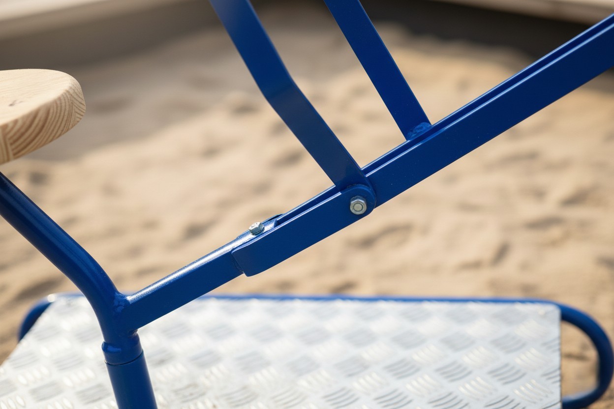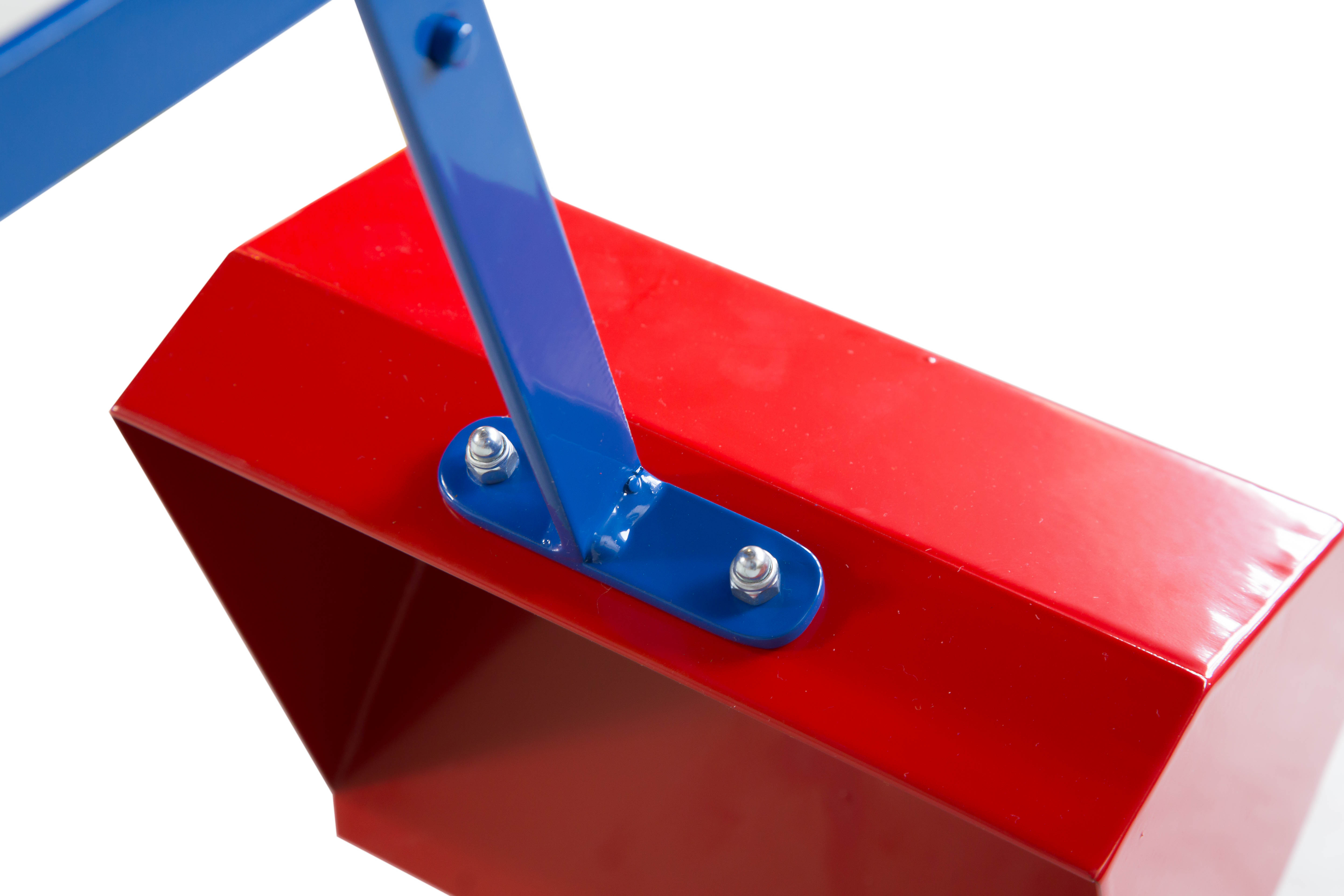 Diese Baggerausführung kann auch außerhalb eines kleinen Sandkasten aufgestellt werden. Durch die hohe Sitzposition kann von außen in den Sandkasten hinein gebaggert werden. Wie seine beiden "Brüder", der Sandbagger mit Standardfuß und der Sandbagger mit Rädern, ist dieser Bagger manuell bedienbar und 360° drehbar. Der Ausleger besteht aus sehr stabilem Bandstahl. Alle Teile des Lautenbacher Baggers werden von Hand bearbeitet und anschließend pulverbeschichtet in rot und blau.